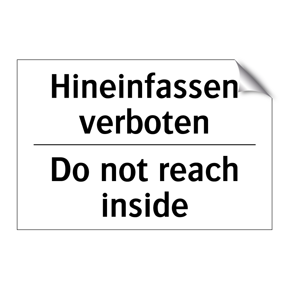 Zweisprachiges Verbotsschild mit deutschem Text Hineinfassen verboten und englischem Text Do not reach inside