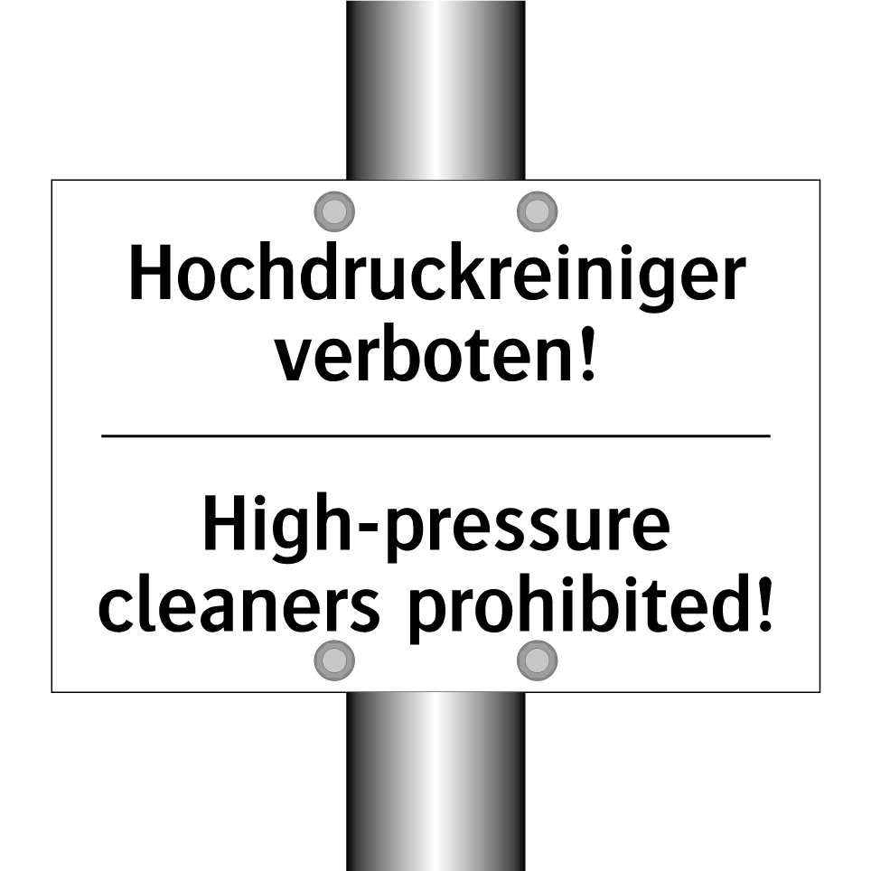 Zweisprachiges Verbotsschild mit deutschem Text Hochdruckreiniger verboten! und englischem Text High-pressure cleaners prohibited!