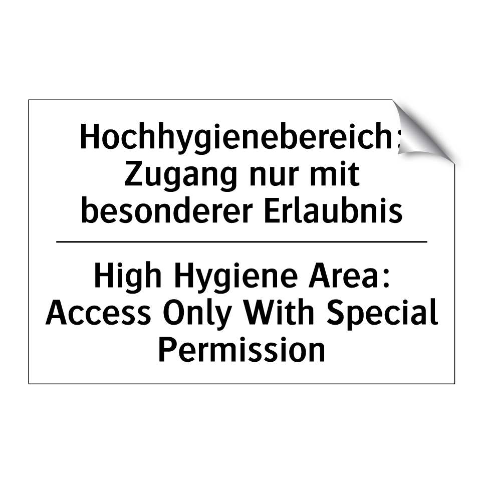 Zweisprachiges Verbotsschild mit deutschem Text Hochhygienebereich: Zugang nur mit besonderer Erlaubnis und englischem Text High Hygiene Area: Access Only With Special Permission
