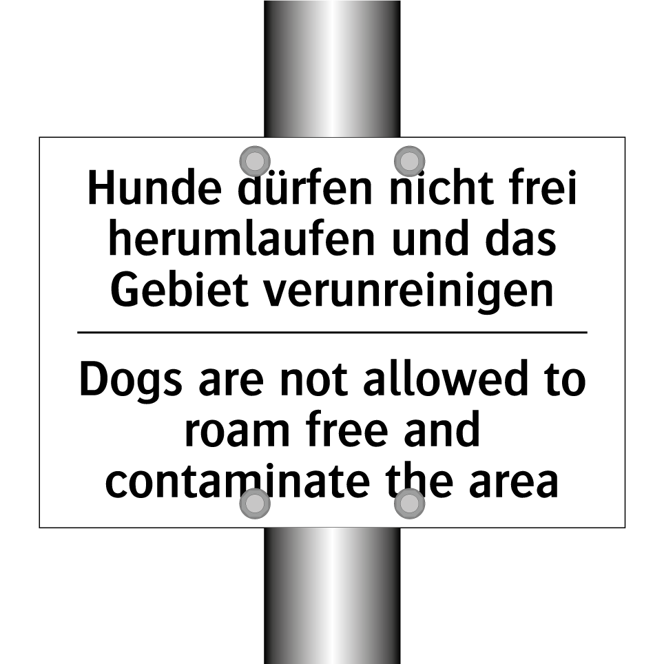 Zweisprachiges Verbotsschild mit deutschem Text Hunde dürfen nicht frei herumlaufen und das Gebiet verunreinigen und englischem Text Dogs are not allowed to roam free and contaminate the area