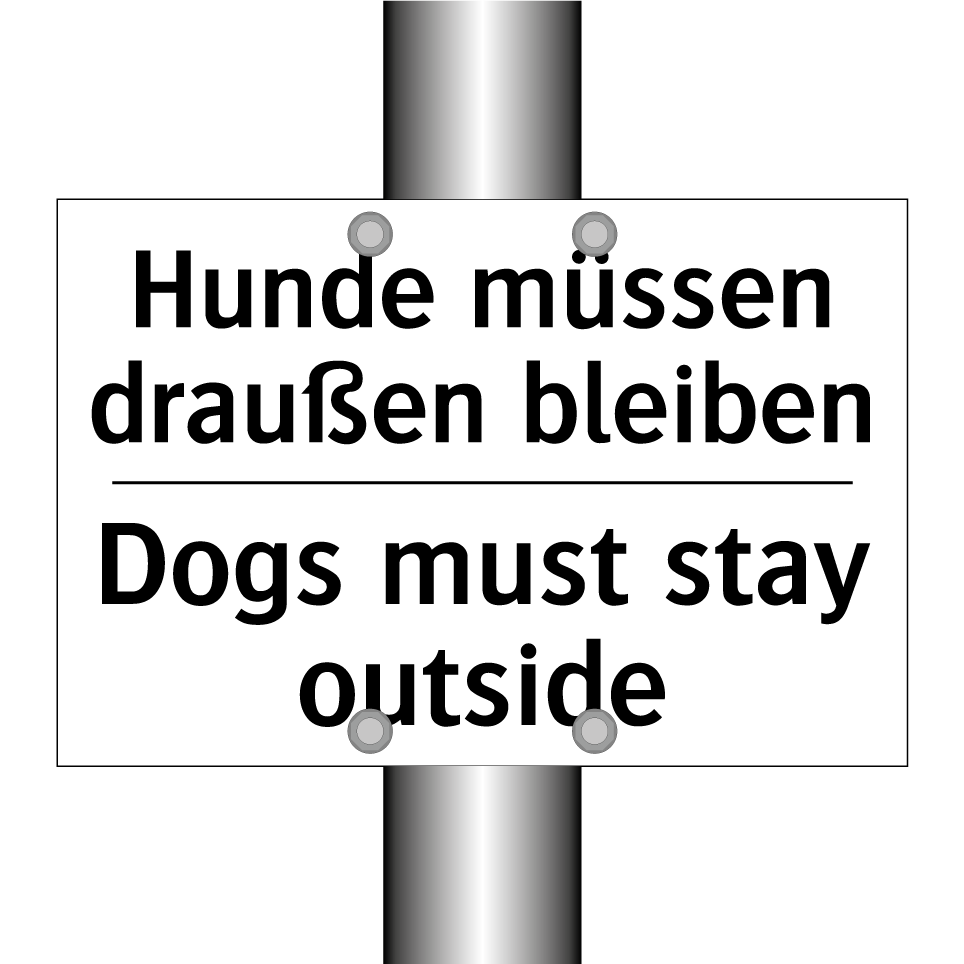 Zweisprachiges Verbotsschild mit deutschem Text Hunde müssen draußen bleiben und englischem Text Dogs must stay outside