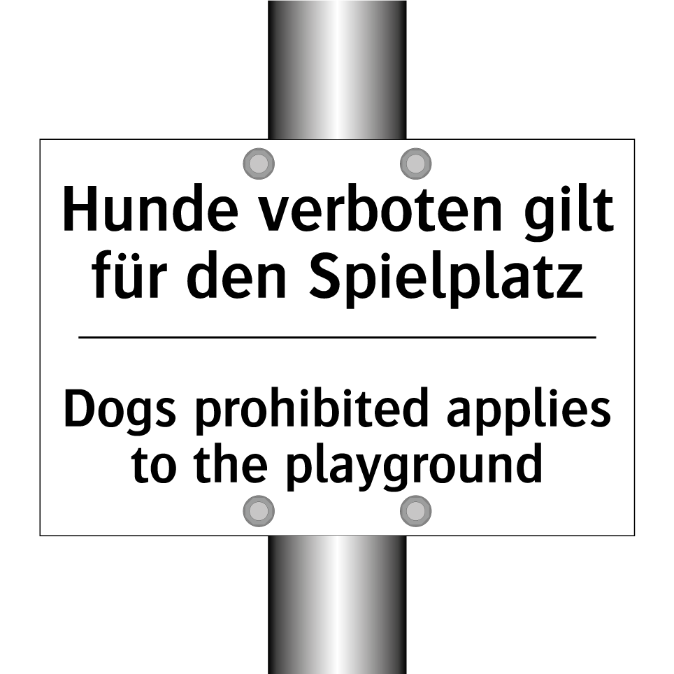 Zweisprachiges Verbotsschild mit deutschem Text Hunde verboten gilt für den Spielplatz und englischem Text Dogs prohibited applies to the playground