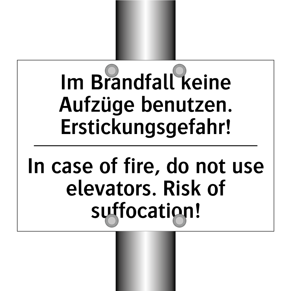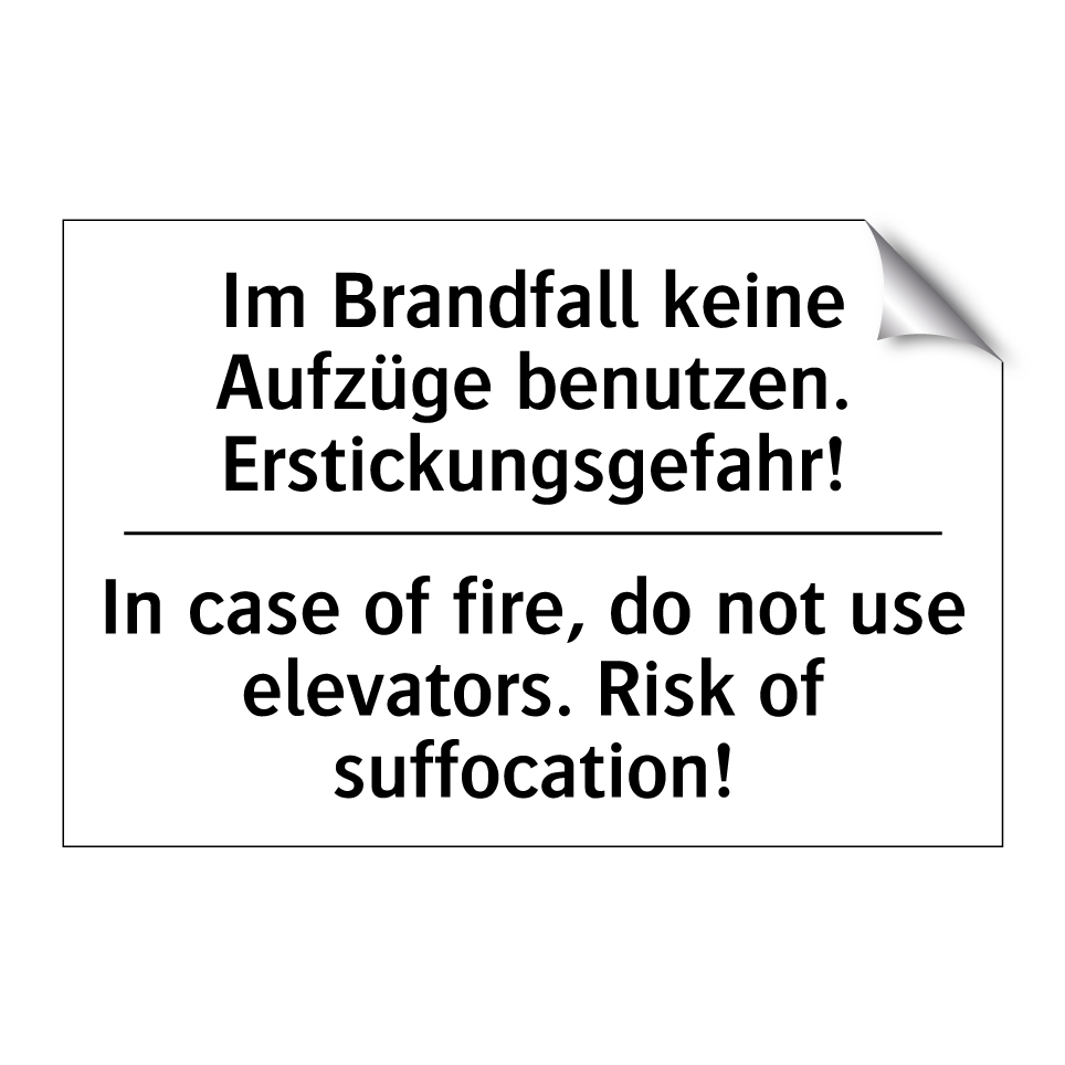 Zweisprachiges Verbotsschild mit deutschem Text Im Brandfall keine Aufzüge benutzen. Erstickungsgefahr! und englischem Text In case of fire, do not use elevators. Risk of suffocation!