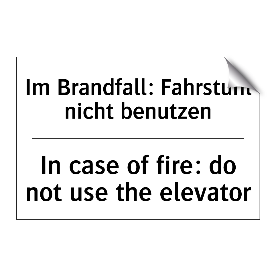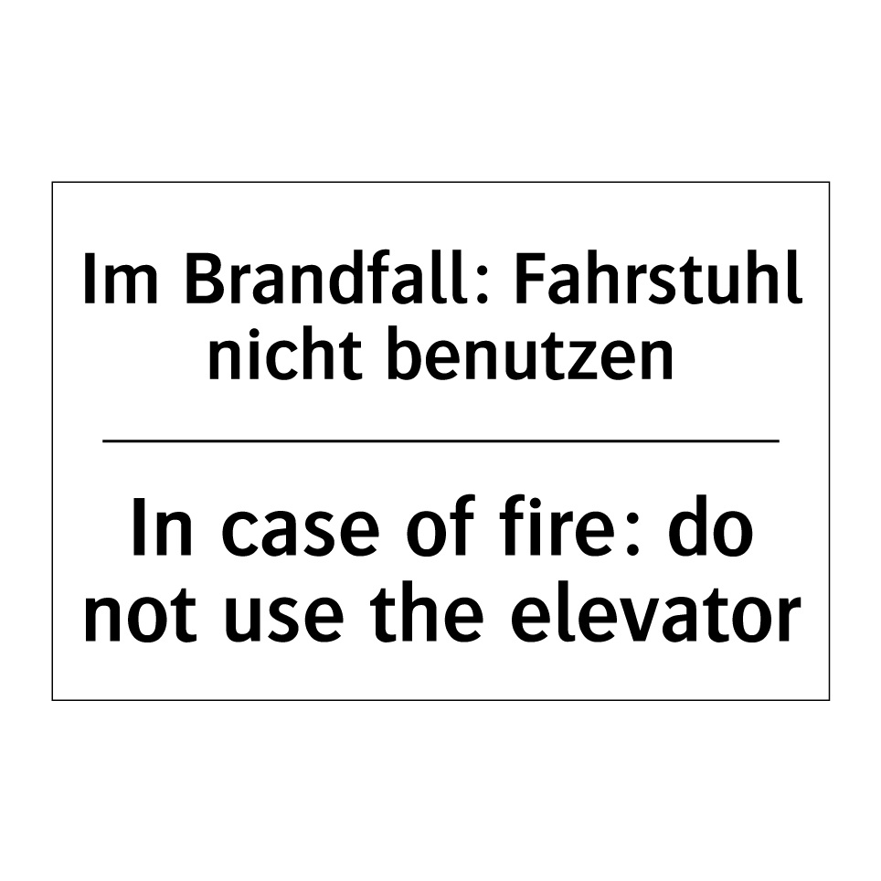 Zweisprachiges Verbotsschild mit deutschem Text Im Brandfall: Fahrstuhl nicht benutzen und englischem Text In case of fire: do not use the elevator