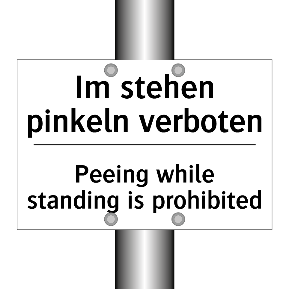 Zweisprachiges Verbotsschild mit deutschem Text Im stehen pinkeln verboten und englischem Text Peeing while standing is prohibited