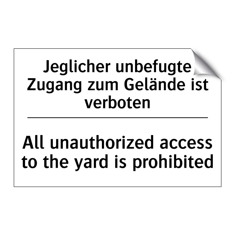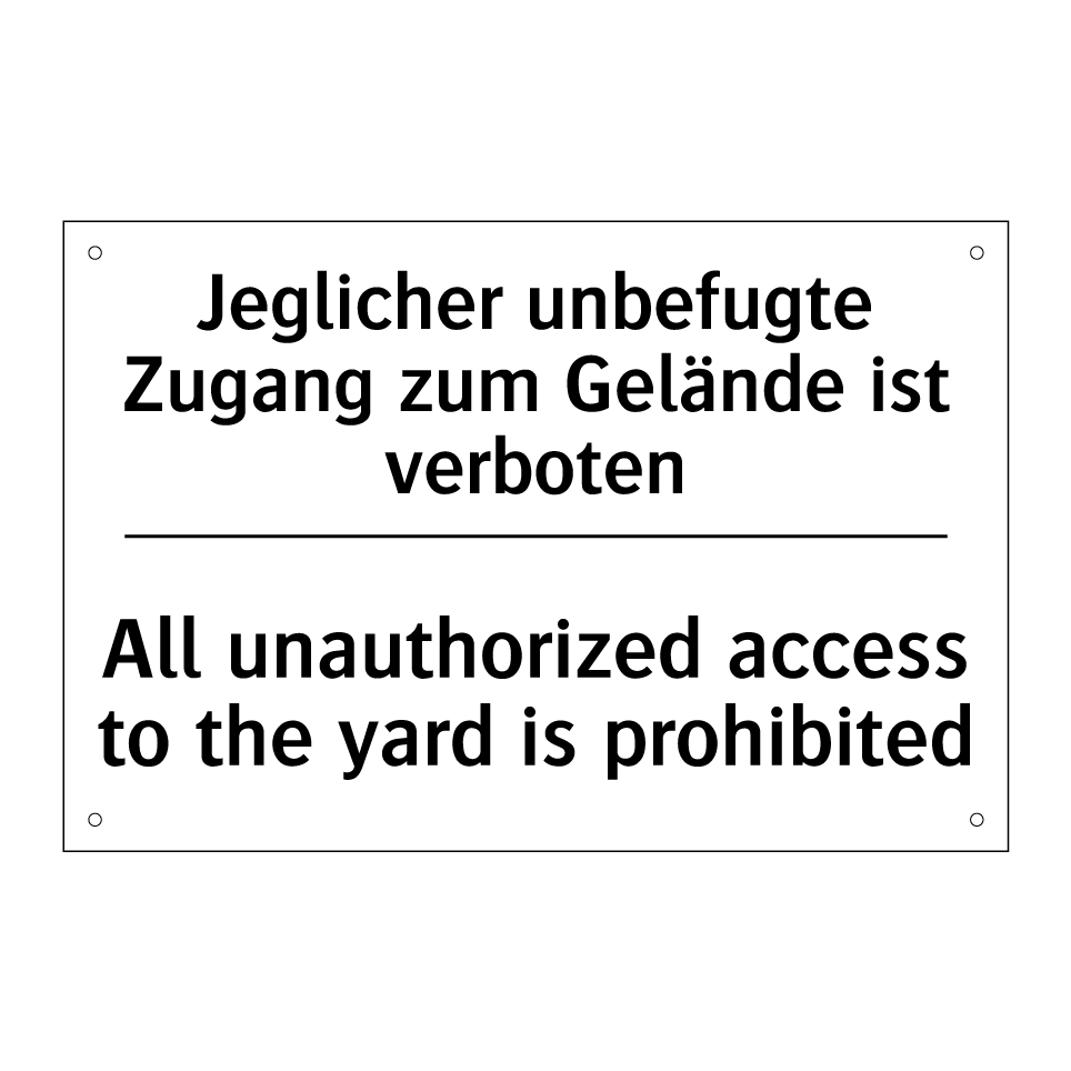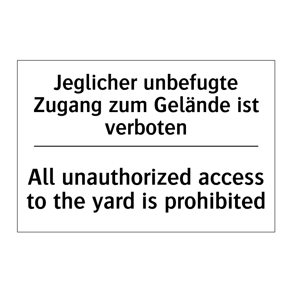 Zweisprachiges Verbotsschild mit deutschem Text Jeglicher unbefugte Zugang zum Gelände ist verboten und englischem Text All unauthorized access to the yard is prohibited