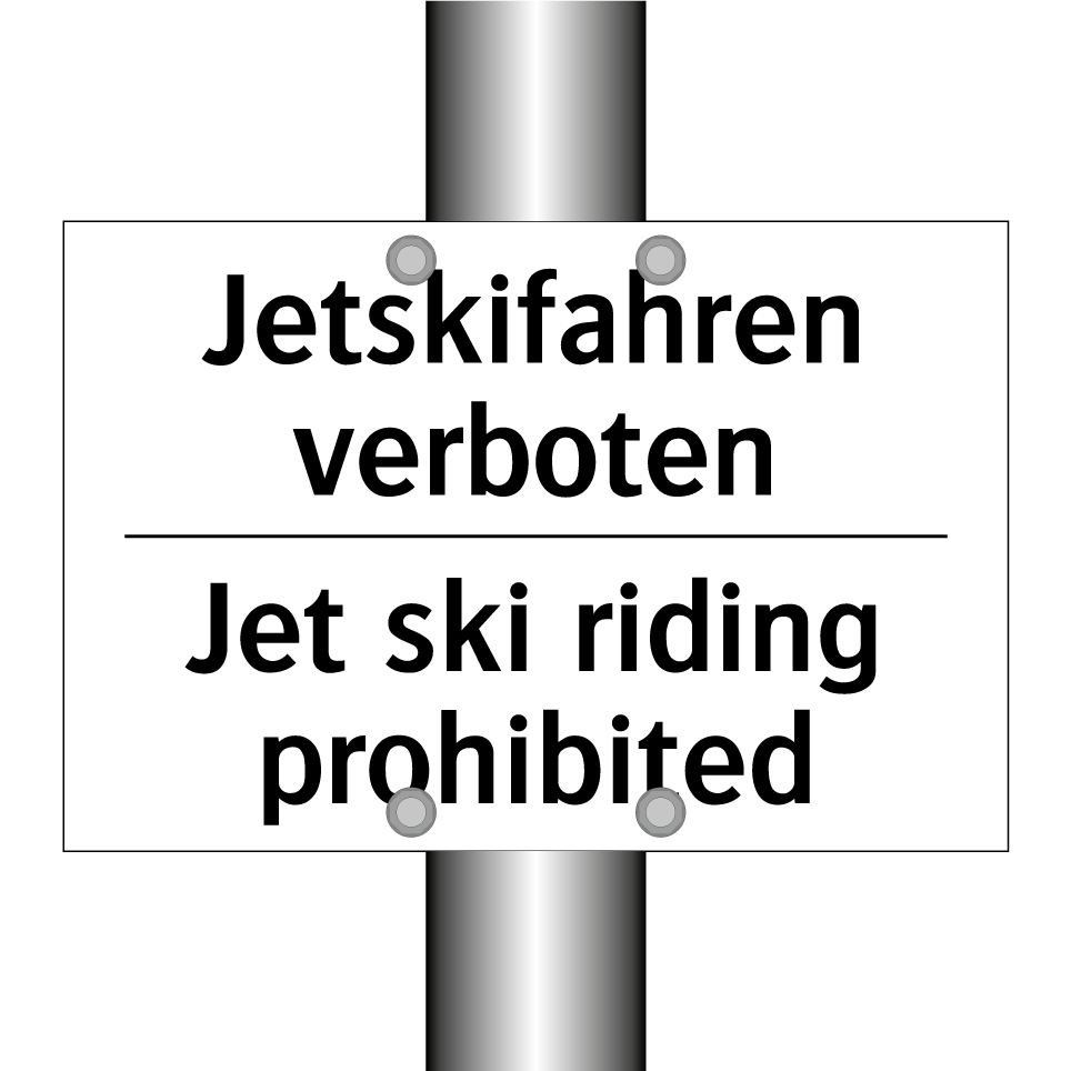 Zweisprachiges Verbotsschild mit deutschem Text Jetskifahren verboten und englischem Text Jet ski riding prohibited