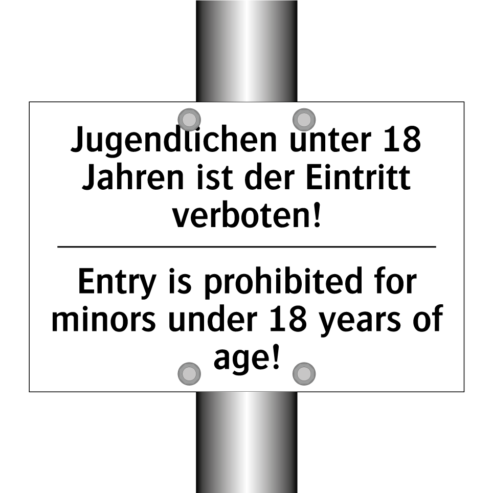 Zweisprachiges Verbotsschild mit deutschem Text Jugendlichen unter 18 Jahren ist der Eintritt verboten! und englischem Text Entry is prohibited for minors under 18 years of age!