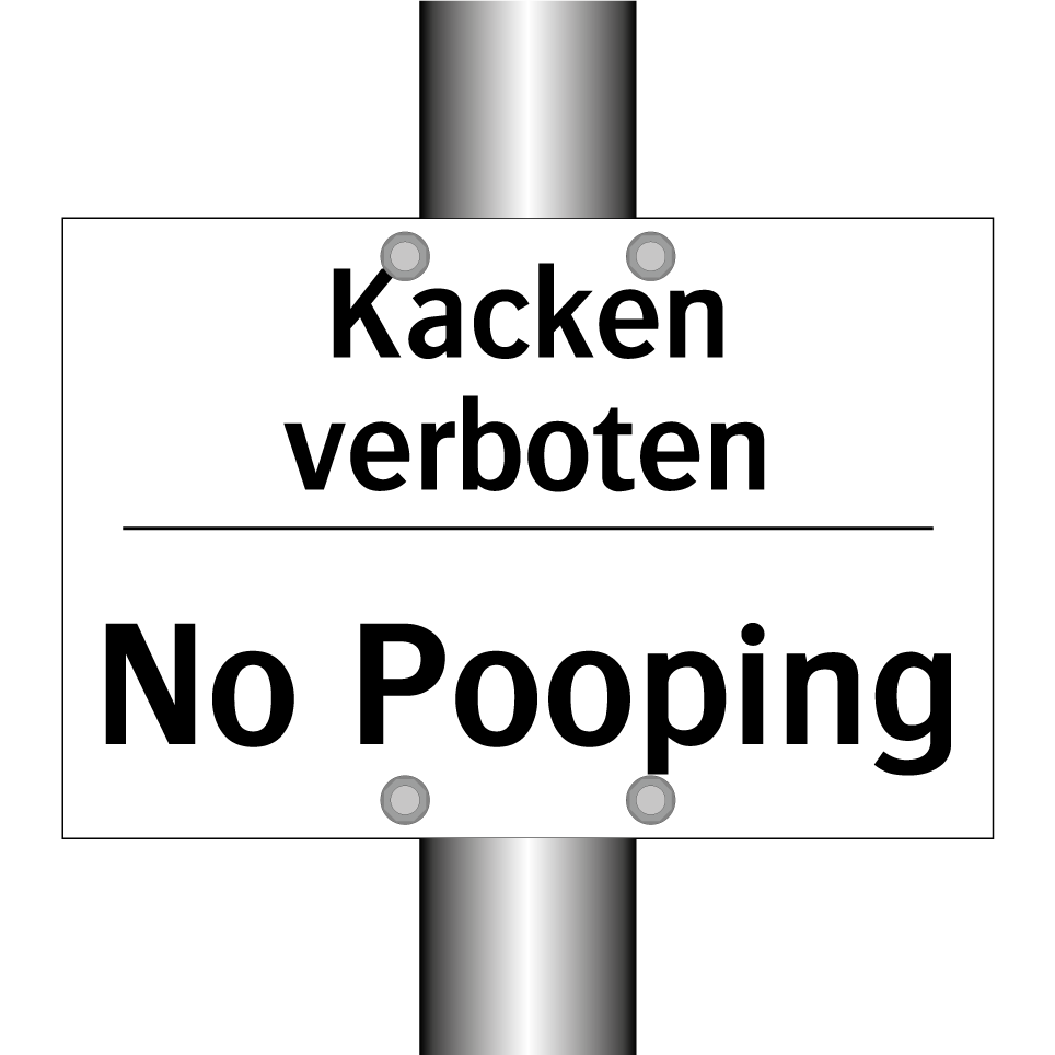 Zweisprachiges Verbotsschild mit deutschem Text Kacken verboten und englischem Text No Pooping