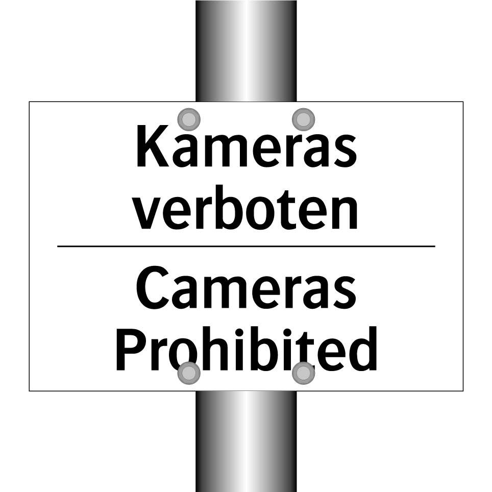 Zweisprachiges Verbotsschild mit deutschem Text Kameras verboten und englischem Text Cameras Prohibited