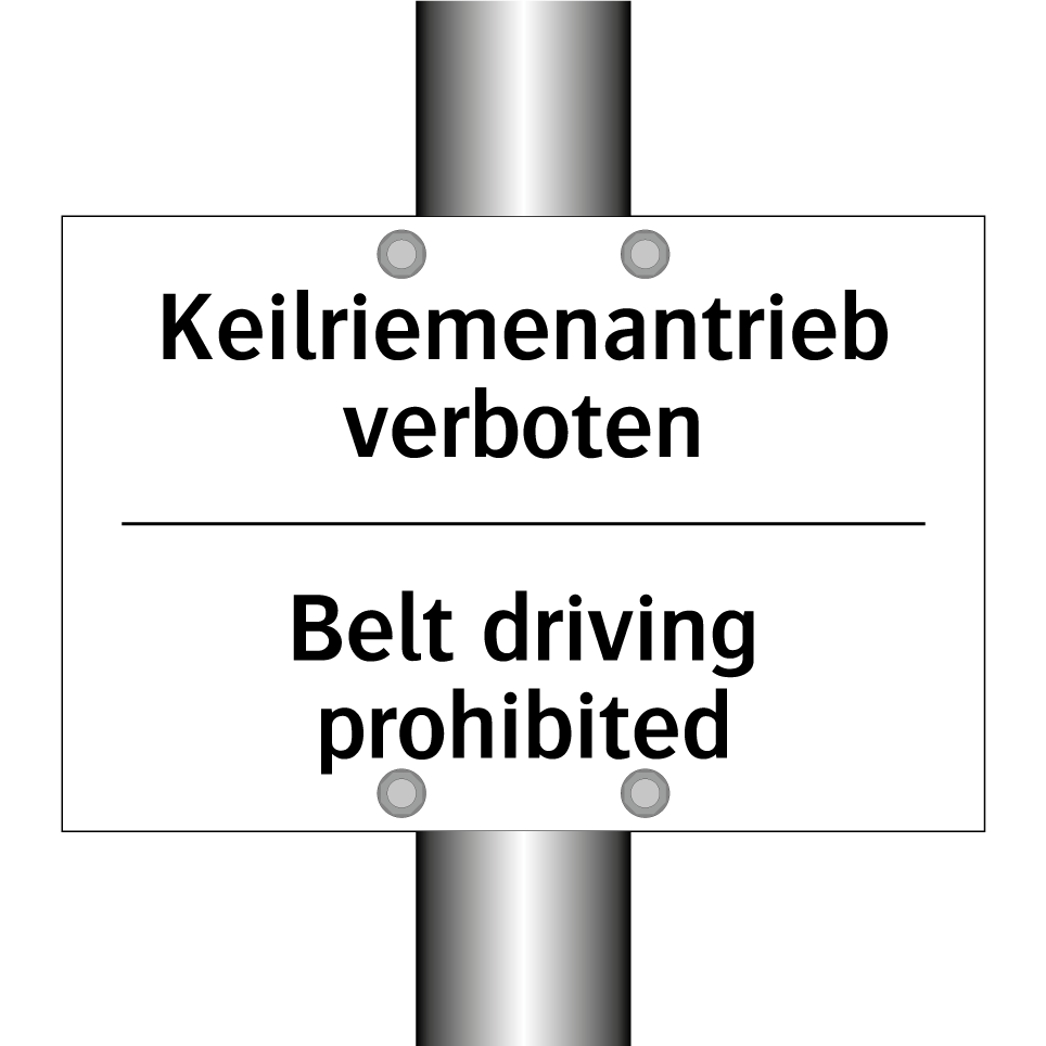Zweisprachiges Verbotsschild mit deutschem Text Keilriemenantrieb verboten und englischem Text Belt driving prohibited