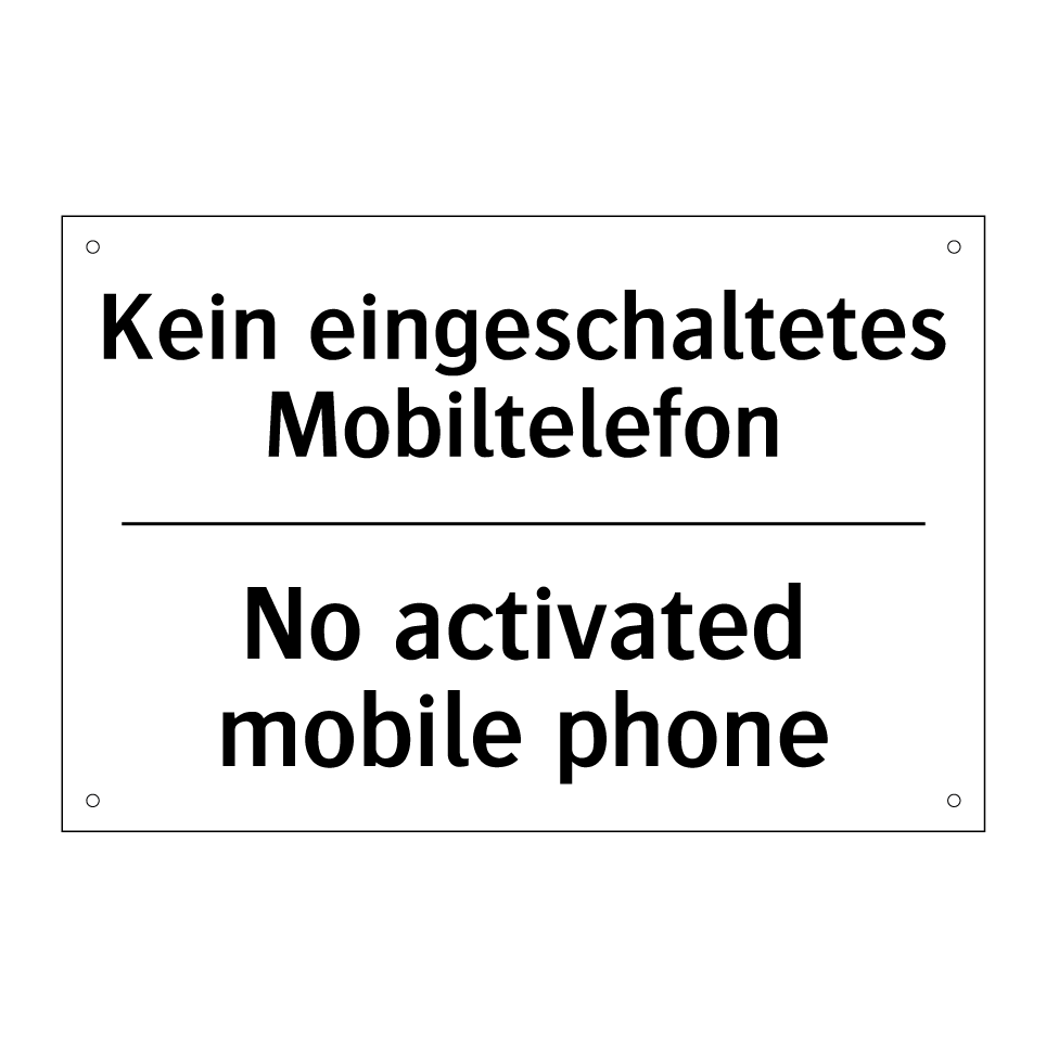 Zweisprachiges Verbotsschild mit deutschem Text Kein eingeschaltetes Mobiltelefon und englischem Text No activated mobile phone