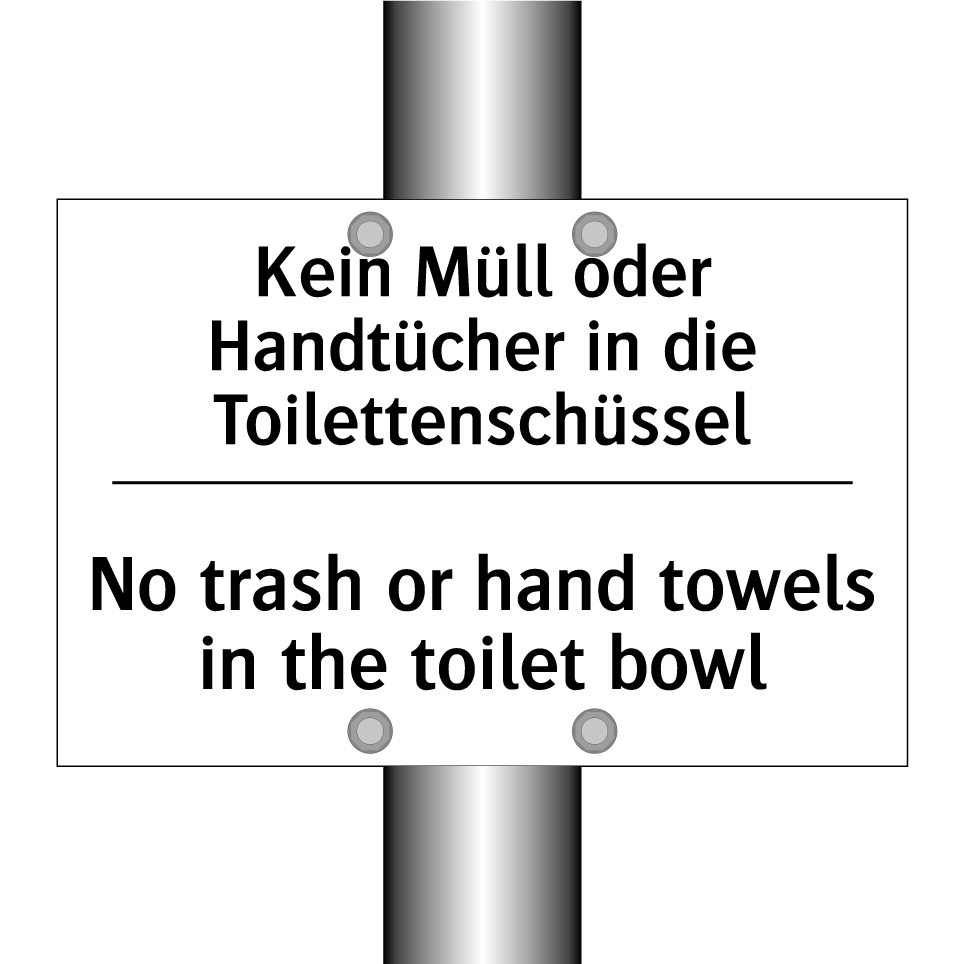 Zweisprachiges Verbotsschild mit deutschem Text Kein Müll oder Handtücher in die Toilettenschüssel und englischem Text No trash or hand towels in the toilet bowl