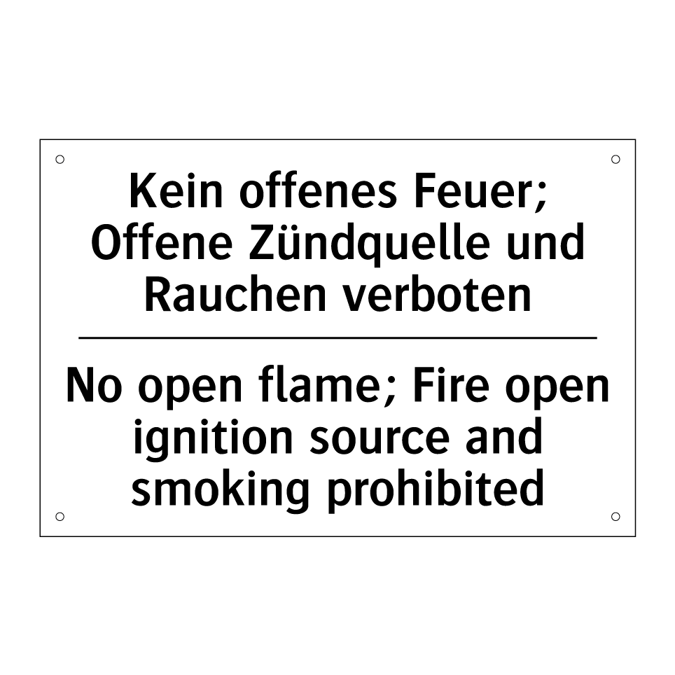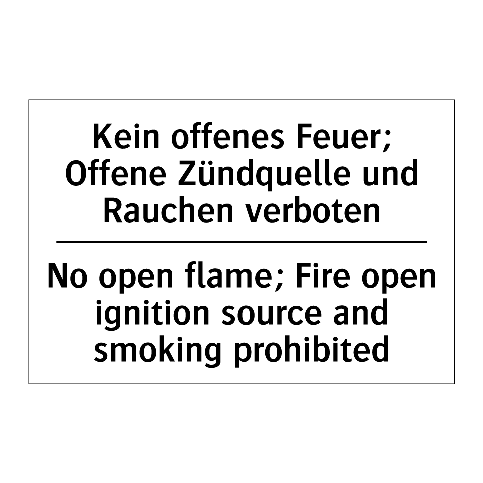 Zweisprachiges Verbotsschild mit deutschem Text Kein offenes Feuer; Offene Zündquelle und Rauchen verboten und englischem Text No open flame; Fire open ignition source and smoking prohibited