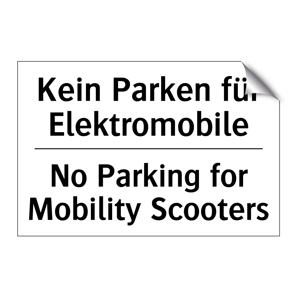 Zweisprachiges Verbotsschild mit deutschem Text Kein Parken für Elektromobile und englischem Text No Parking for Mobility Scooters
