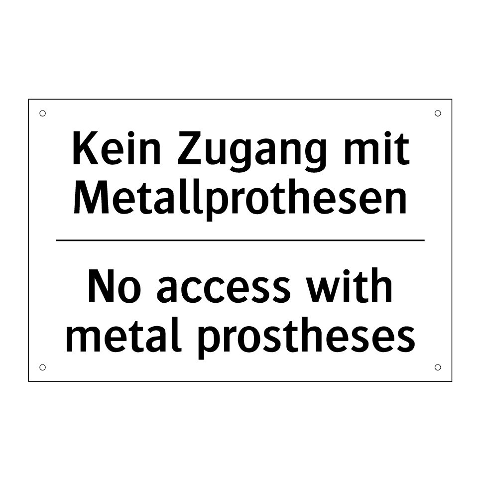 Zweisprachiges Verbotsschild mit deutschem Text Kein Zugang mit Metallprothesen und englischem Text No access with metal prostheses