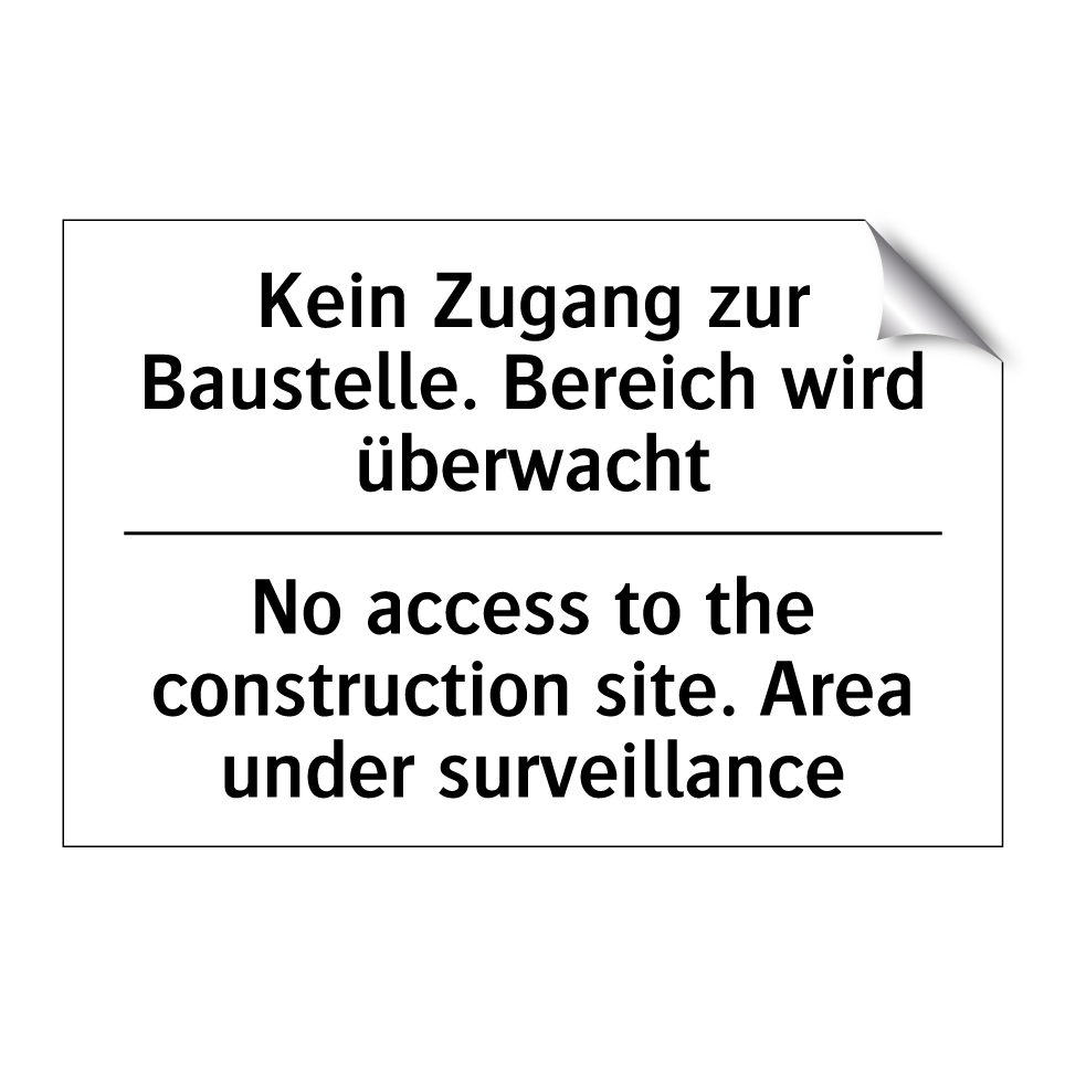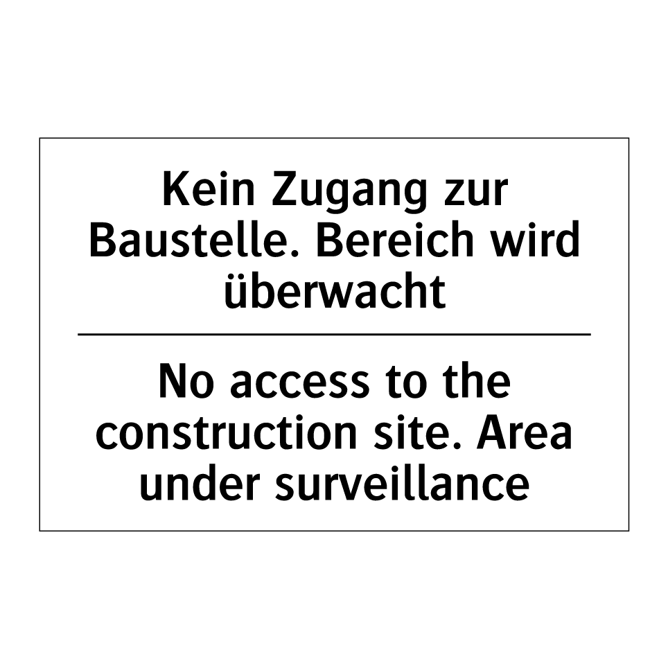 Zweisprachiges Verbotsschild mit deutschem Text Kein Zugang zur Baustelle. Bereich wird überwacht und englischem Text No access to the construction site. Area under surveillance