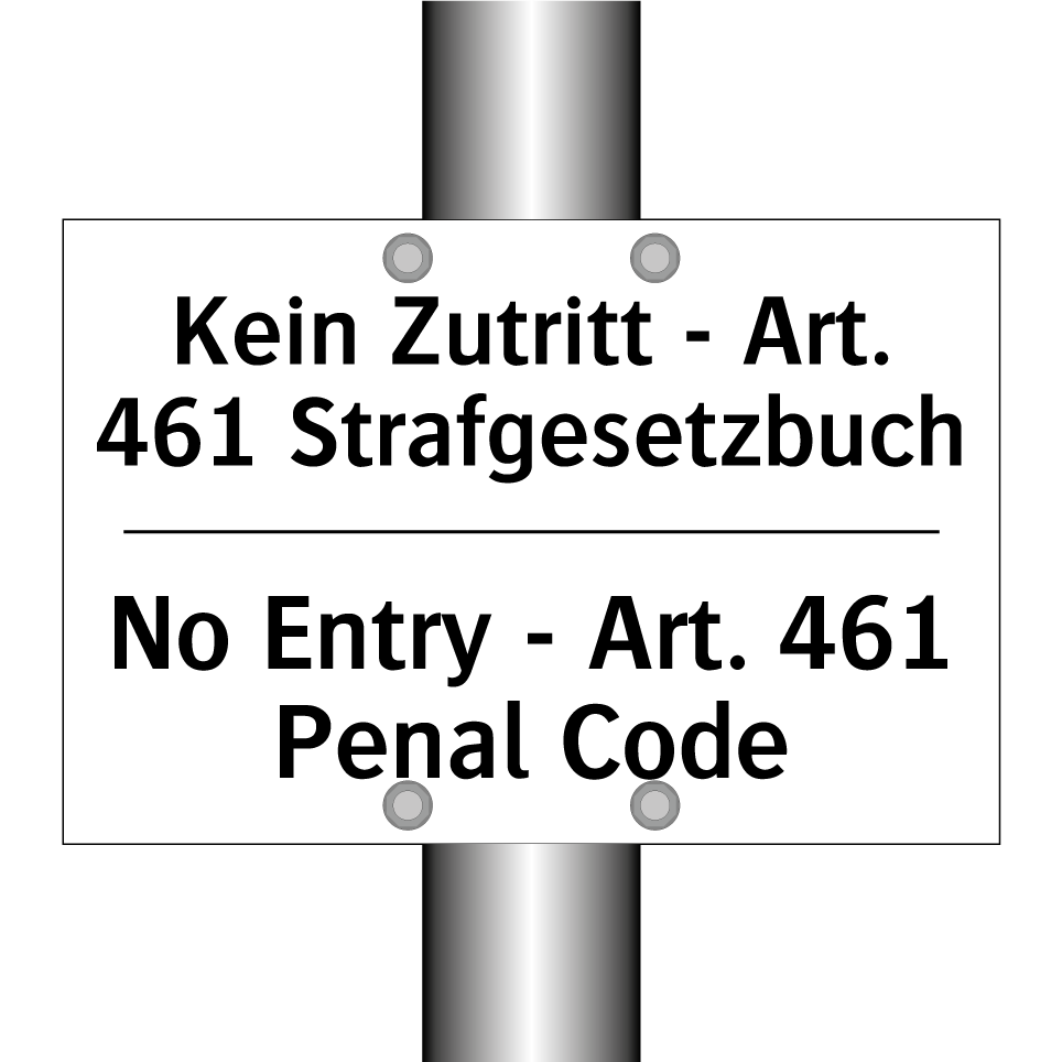 Zweisprachiges Verbotsschild mit deutschem Text Kein Zutritt - Art. 461 Strafgesetzbuch und englischem Text No Entry - Art. 461 Penal Code