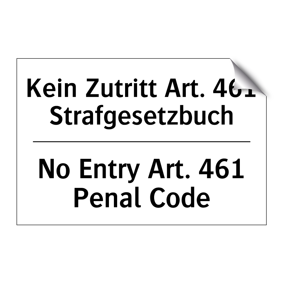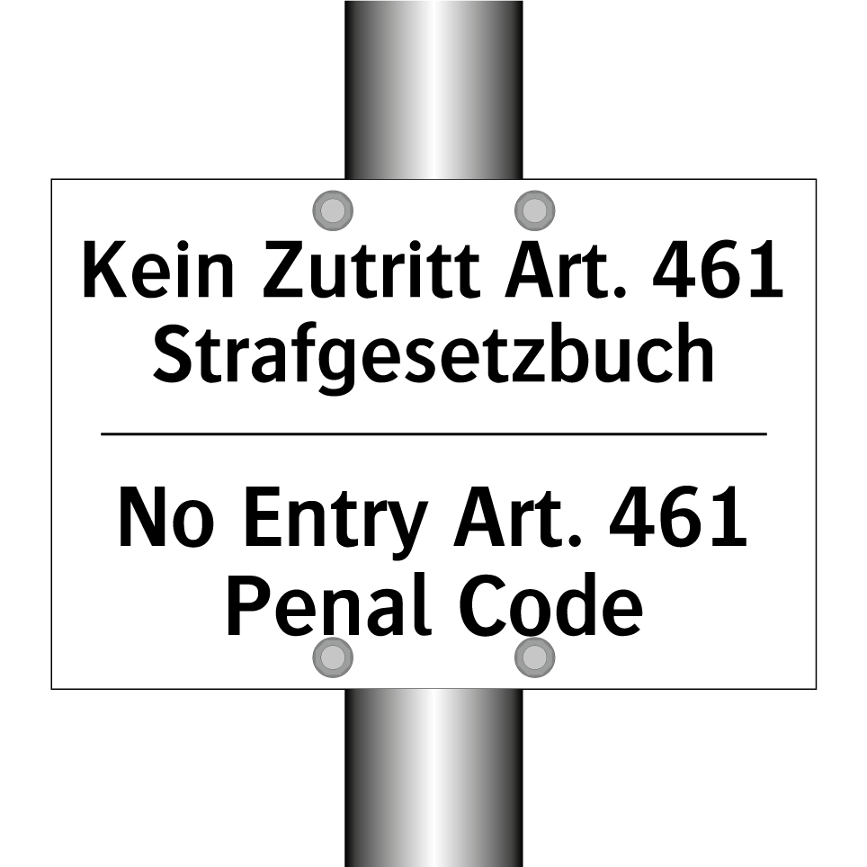 Zweisprachiges Verbotsschild mit deutschem Text Kein Zutritt Art. 461 Strafgesetzbuch und englischem Text No Entry Art. 461 Penal Code