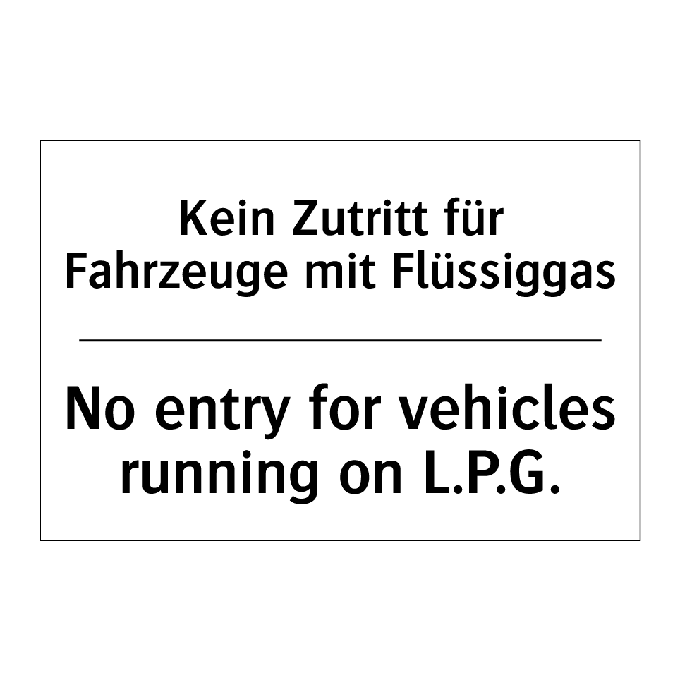 Zweisprachiges Verbotsschild mit deutschem Text Kein Zutritt für Fahrzeuge mit Flüssiggas und englischem Text No entry for vehicles running on L.P.G.