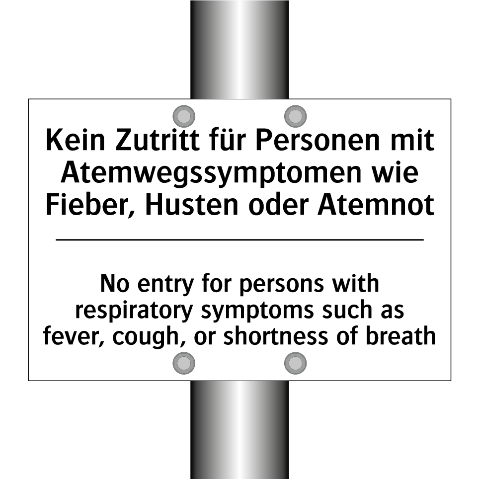 Zweisprachiges Verbotsschild mit deutschem Text Kein Zutritt für Personen mit Atemwegssymptomen wie Fieber, Husten oder Atemnot und englischem Text No entry for persons with respiratory symptoms such as fever, cough, or shortness of breath