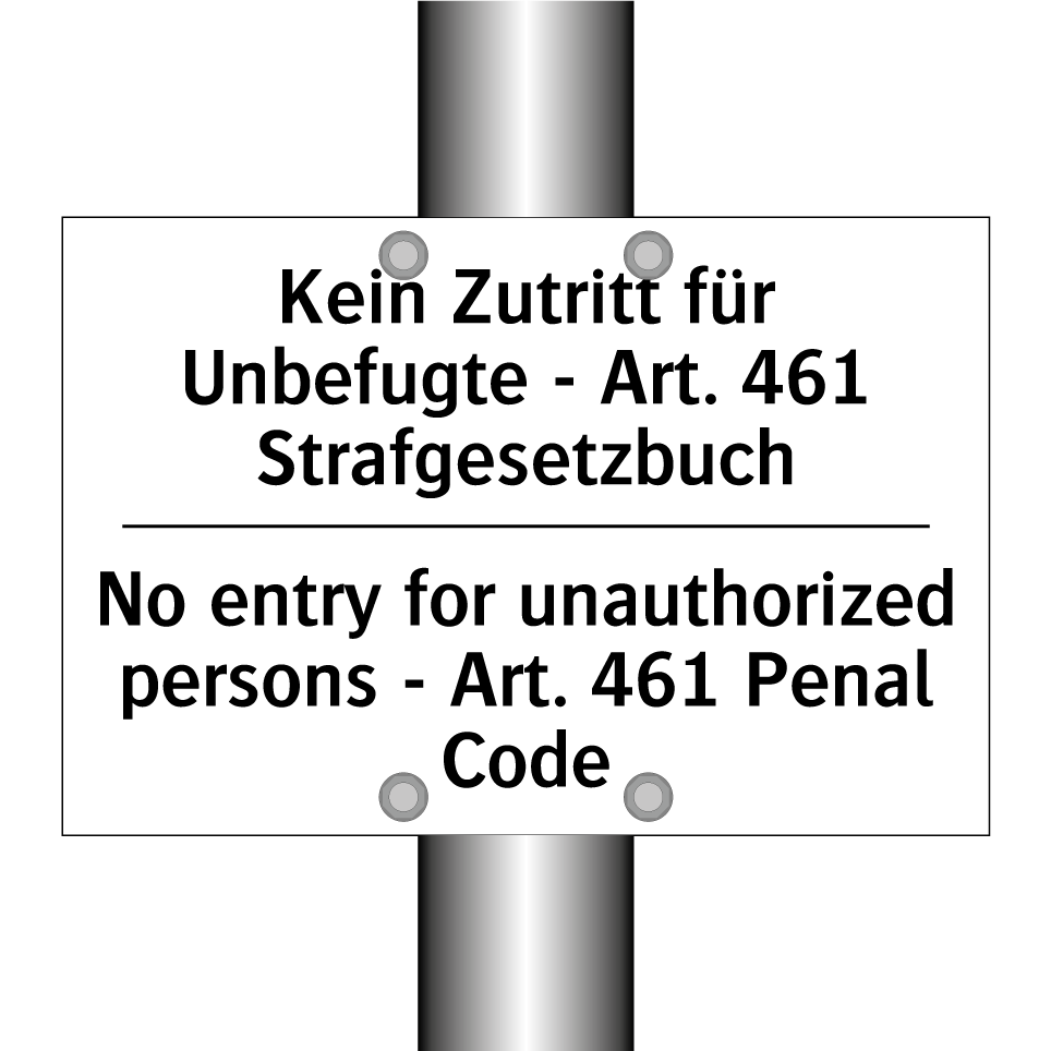 Zweisprachiges Verbotsschild mit deutschem Text Kein Zutritt für Unbefugte - Art. 461 Strafgesetzbuch und englischem Text No entry for unauthorized persons - Art. 461 Penal Code