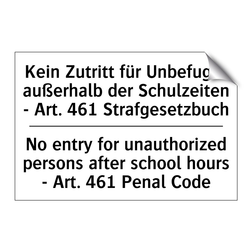Zweisprachiges Verbotsschild mit deutschem Text Kein Zutritt für Unbefugte außerhalb der Schulzeiten - Art. 461 Strafgesetzbuch und englischem Text No entry for unauthorized persons after school hours - Art. 461 Penal Code