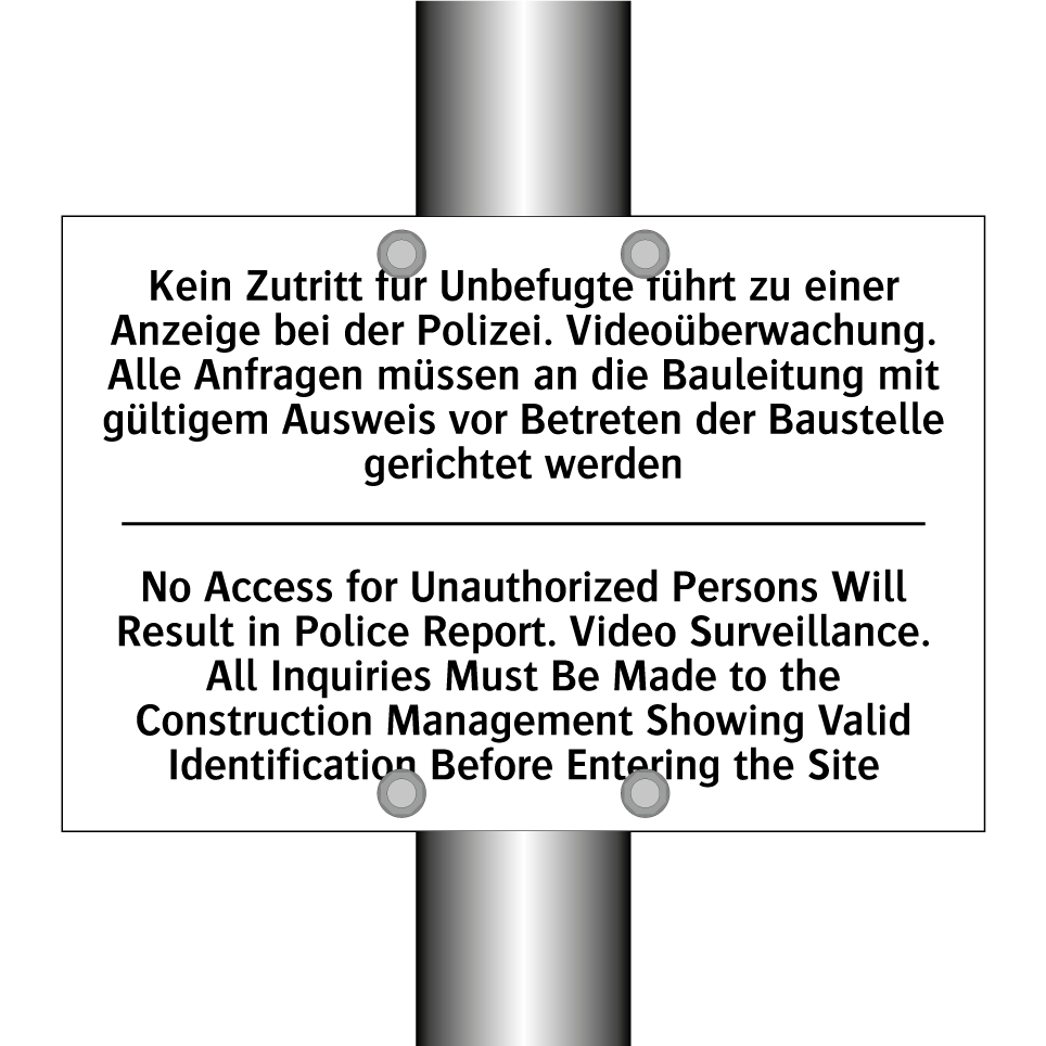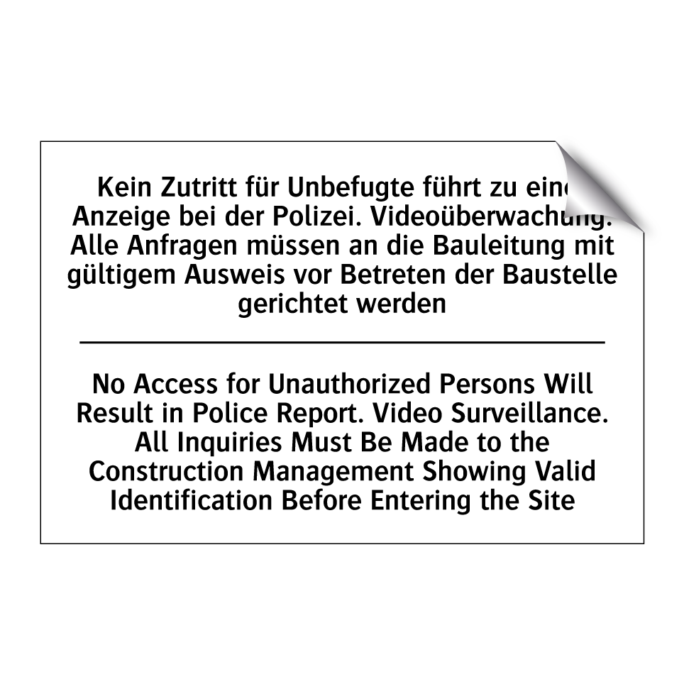 Zweisprachiges Verbotsschild mit deutschem Text Kein Zutritt für Unbefugte führt zu einer Anzeige bei der Polizei. Videoüberwachung. Alle Anfragen müssen an die Bauleitung mit gültigem Ausweis vor Betreten der Baustelle gerichtet werden und englischem Text No Access for Unauthorized Persons Will Result in Police Report. Video Surveillance. All Inquiries Must Be Made to the Construction Management Showing Valid Identification Before Entering the Site