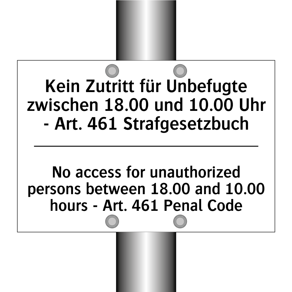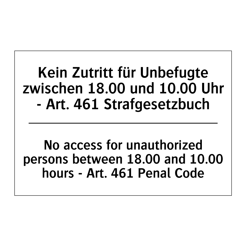 Zweisprachiges Verbotsschild mit deutschem Text Kein Zutritt für Unbefugte zwischen 18.00 und 10.00 Uhr - Art. 461 Strafgesetzbuch und englischem Text No access for unauthorized persons between 18.00 and 10.00 hours - Art. 461 Penal Code