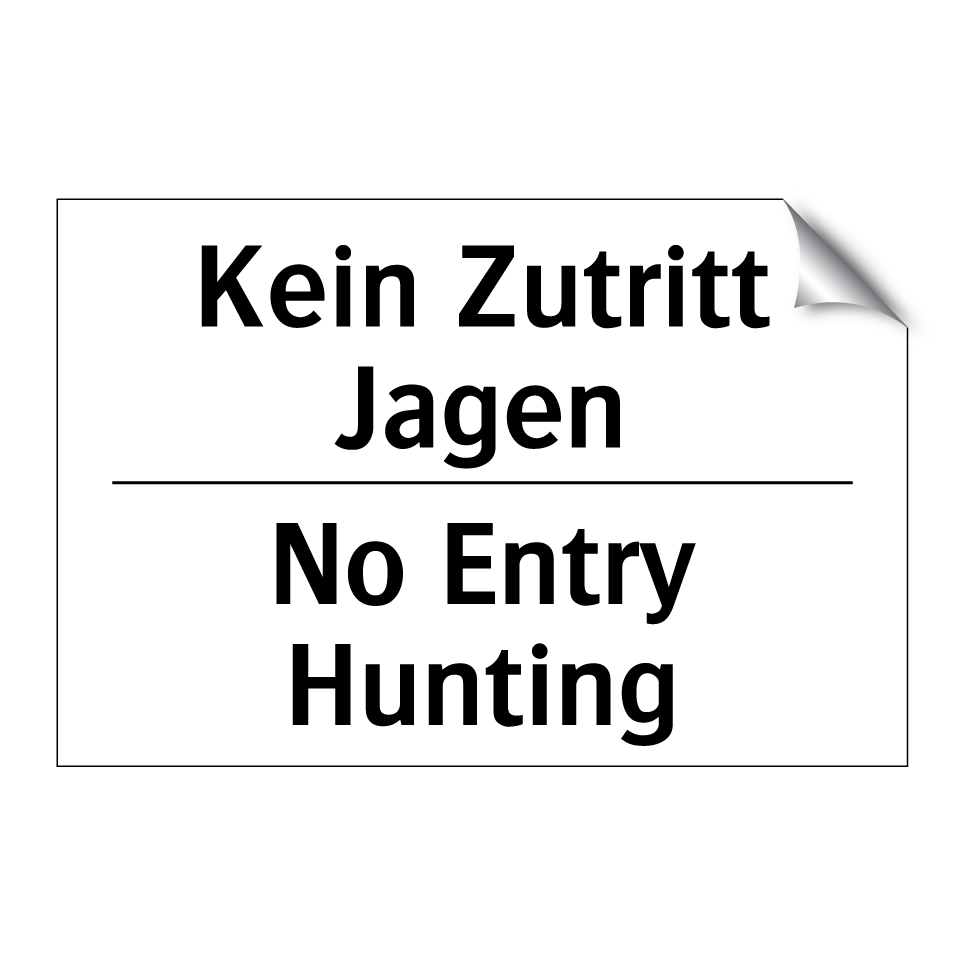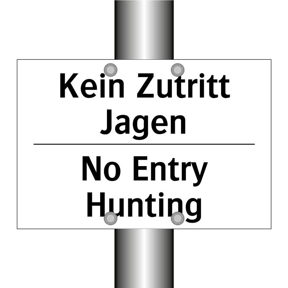 Zweisprachiges Verbotsschild mit deutschem Text Kein Zutritt Jagen und englischem Text No Entry Hunting