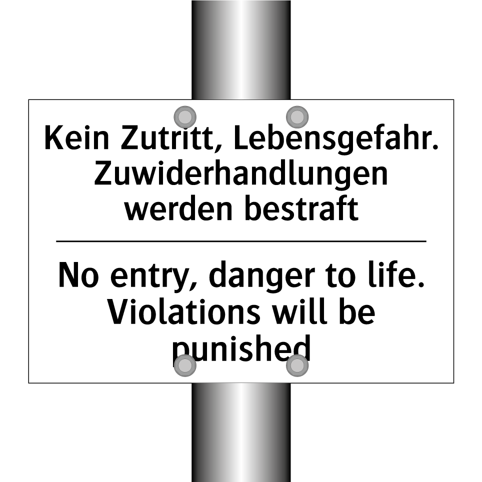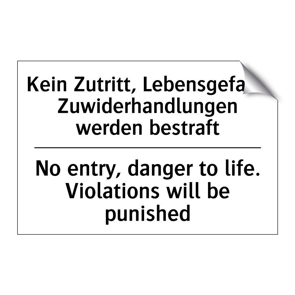 Zweisprachiges Verbotsschild mit deutschem Text Kein Zutritt, Lebensgefahr. Zuwiderhandlungen werden bestraft und englischem Text No entry, danger to life. Violations will be punished
