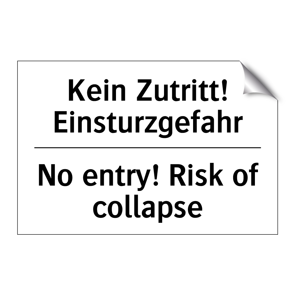 Zweisprachiges Verbotsschild mit deutschem Text Kein Zutritt! Einsturzgefahr und englischem Text No entry! Risk of collapse