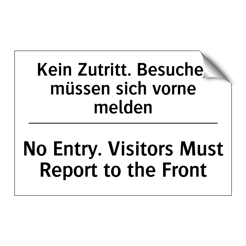 Zweisprachiges Verbotsschild mit deutschem Text Kein Zutritt. Besucher müssen sich vorne melden und englischem Text No Entry. Visitors Must Report to the Front