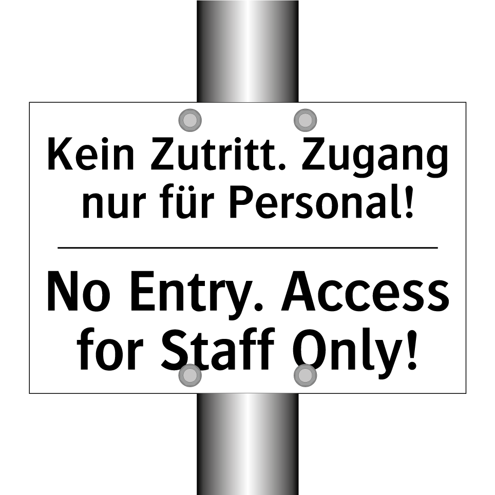 Zweisprachiges Verbotsschild mit deutschem Text Kein Zutritt. Zugang nur für Personal! und englischem Text No Entry. Access for Staff Only!