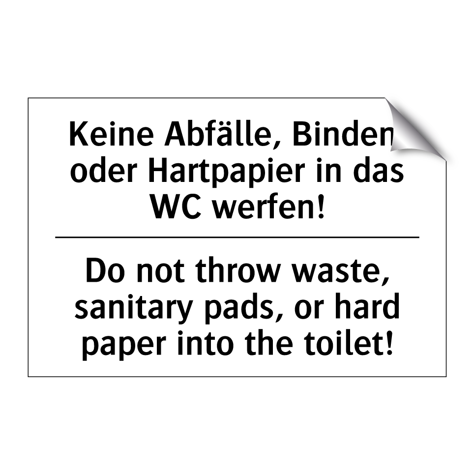 Zweisprachiges Verbotsschild mit deutschem Text Keine Abfälle, Binden, oder Hartpapier in das WC werfen! und englischem Text Do not throw waste, sanitary pads, or hard paper into the toilet!