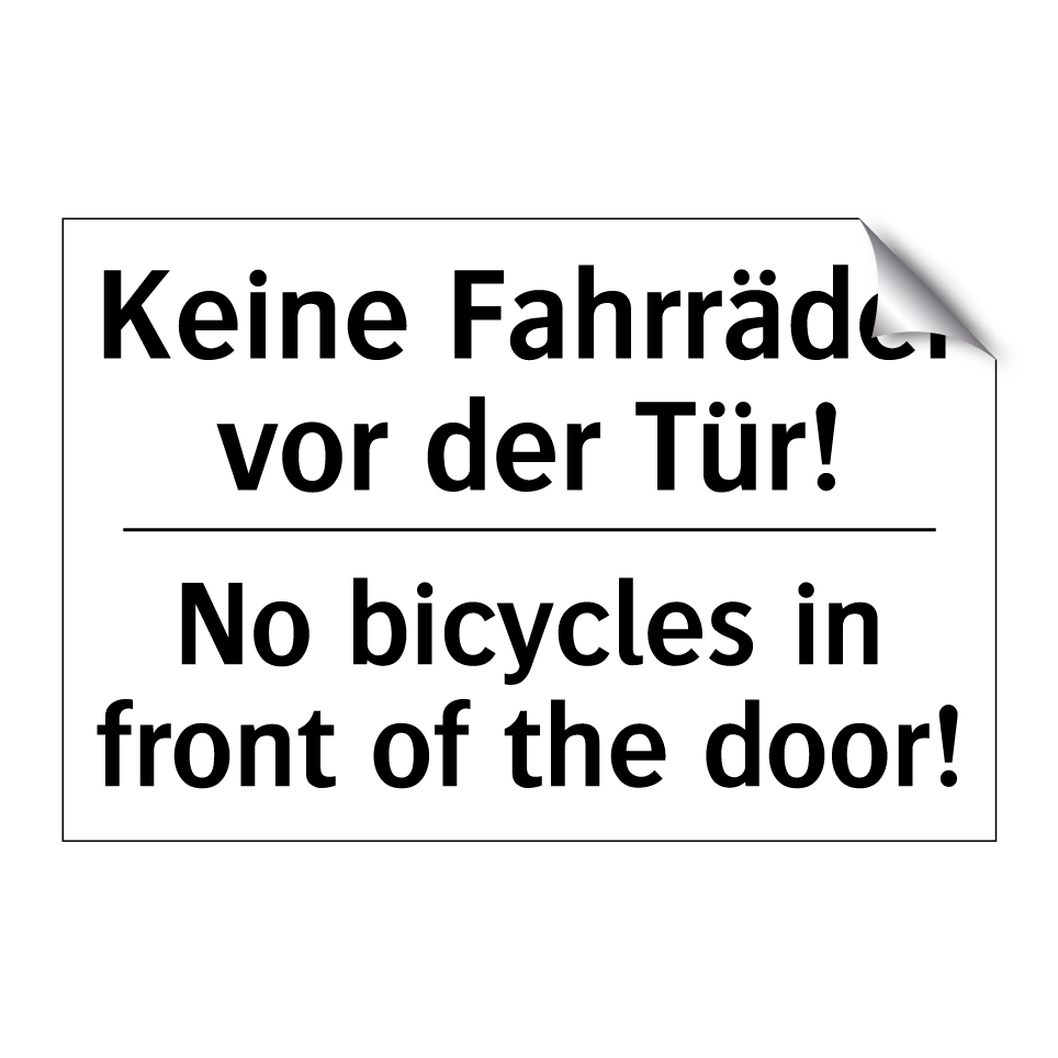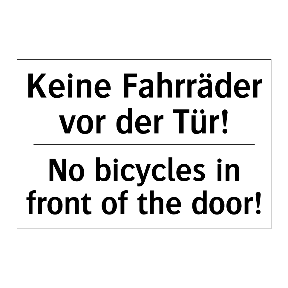 Zweisprachiges Verbotsschild mit deutschem Text Keine Fahrräder vor der Tür! und englischem Text No bicycles in front of the door!