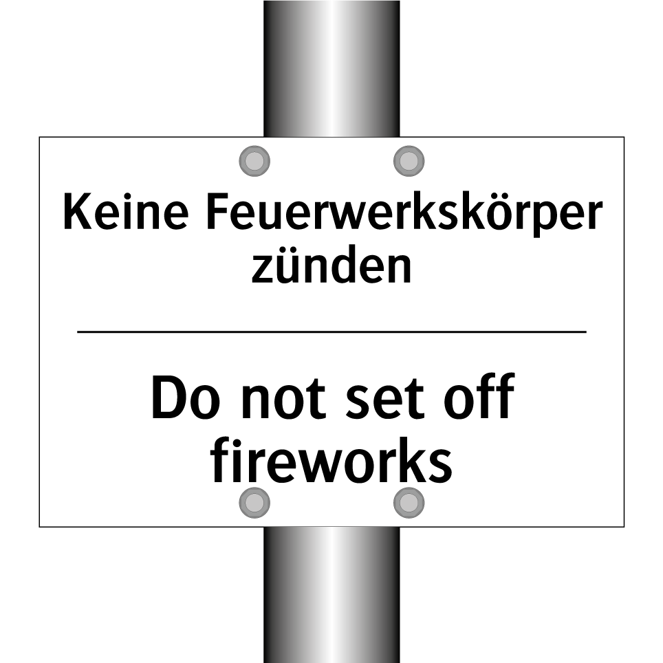 Zweisprachiges Verbotsschild mit deutschem Text Keine Feuerwerkskörper zünden und englischem Text Do not set off fireworks