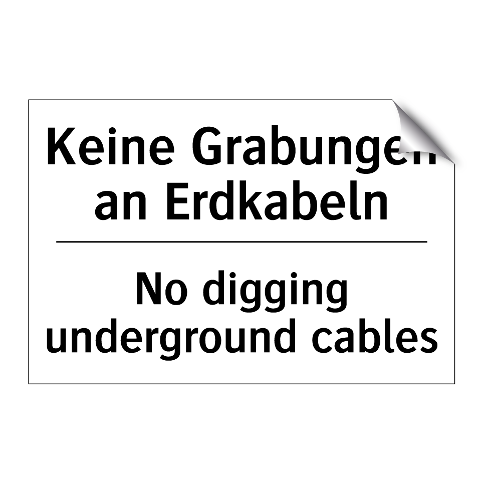 Zweisprachiges Verbotsschild mit deutschem Text Keine Grabungen an Erdkabeln und englischem Text No digging underground cables