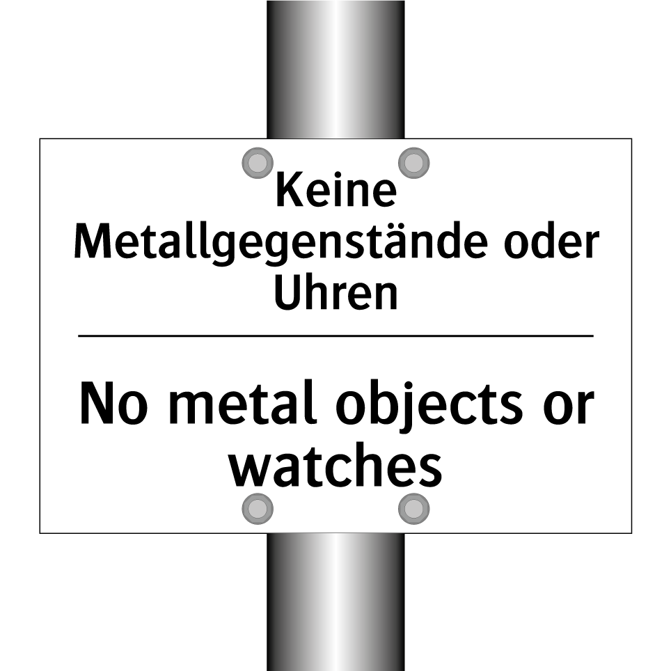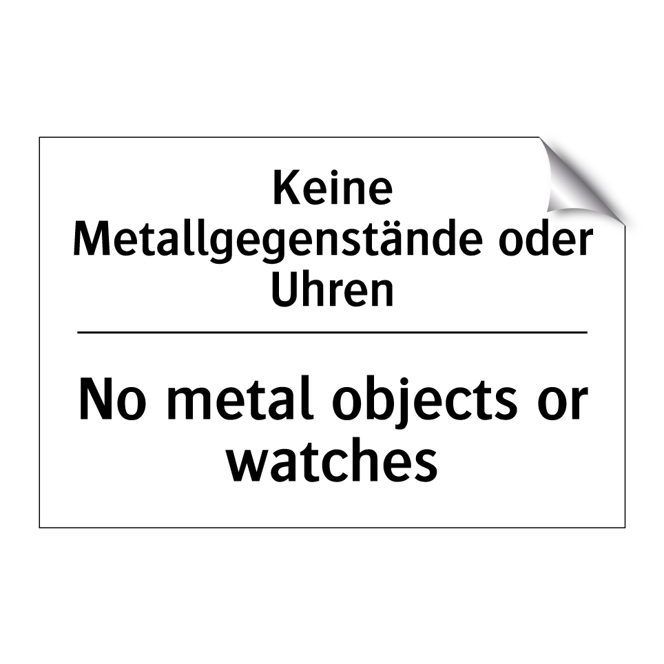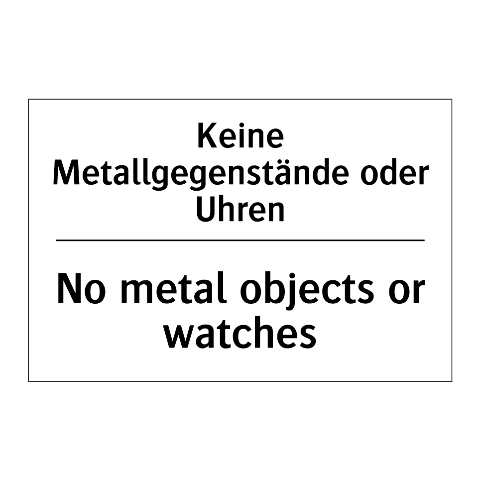 Zweisprachiges Verbotsschild mit deutschem Text Keine Metallgegenstände oder Uhren und englischem Text No metal objects or watches