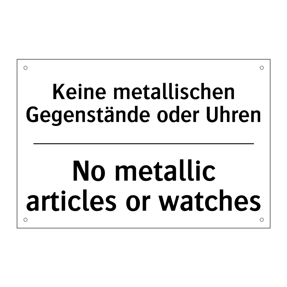 Zweisprachiges Verbotsschild mit deutschem Text Keine metallischen Gegenstände oder Uhren und englischem Text No metallic articles or watches