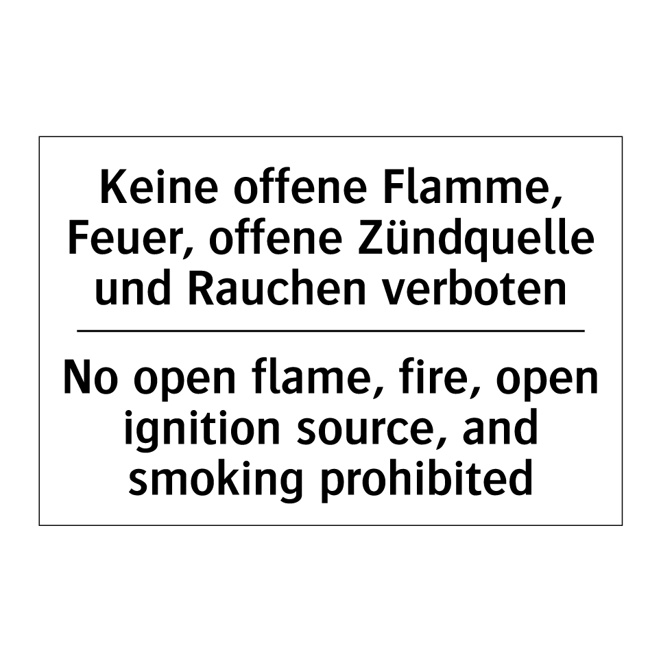 Zweisprachiges Verbotsschild mit deutschem Text Keine offene Flamme, Feuer, offene Zündquelle und Rauchen verboten und englischem Text No open flame, fire, open ignition source, and smoking prohibited