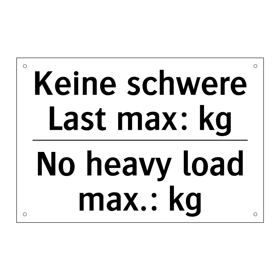 Zweisprachiges Verbotsschild mit deutschem Text Keine schwere Last max: kg und englischem Text No heavy load max.: kg