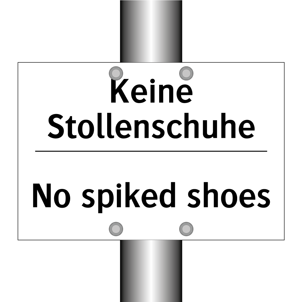 Zweisprachiges Verbotsschild mit deutschem Text Keine Stollenschuhe und englischem Text No spiked shoes