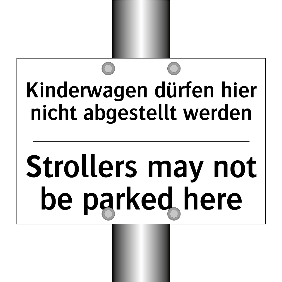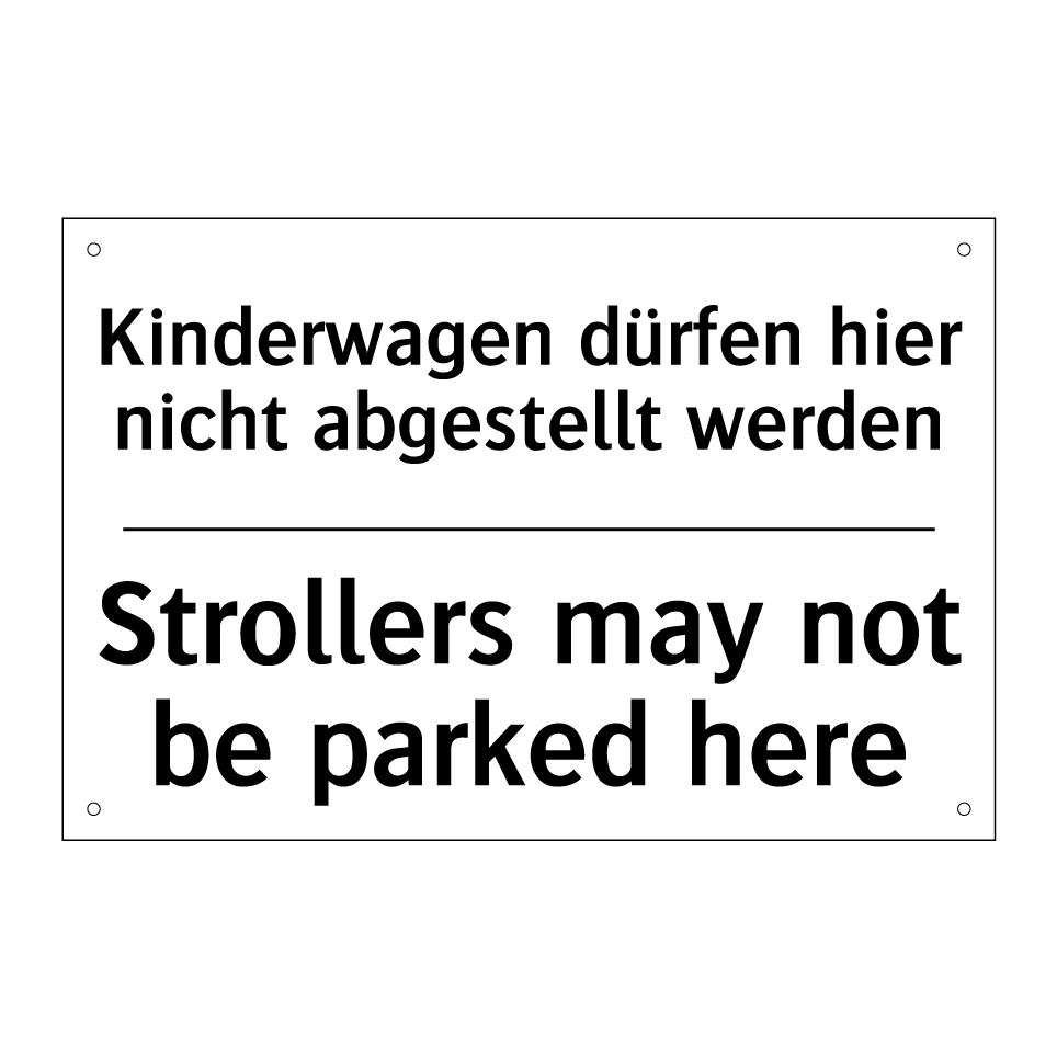 Zweisprachiges Verbotsschild mit deutschem Text Kinderwagen dürfen hier nicht abgestellt werden und englischem Text Strollers may not be parked here