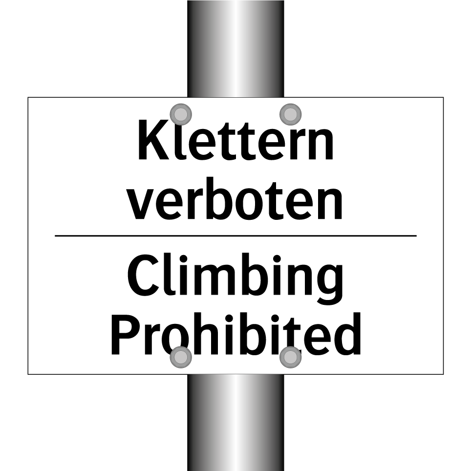 Zweisprachiges Verbotsschild mit deutschem Text Klettern verboten und englischem Text Climbing Prohibited