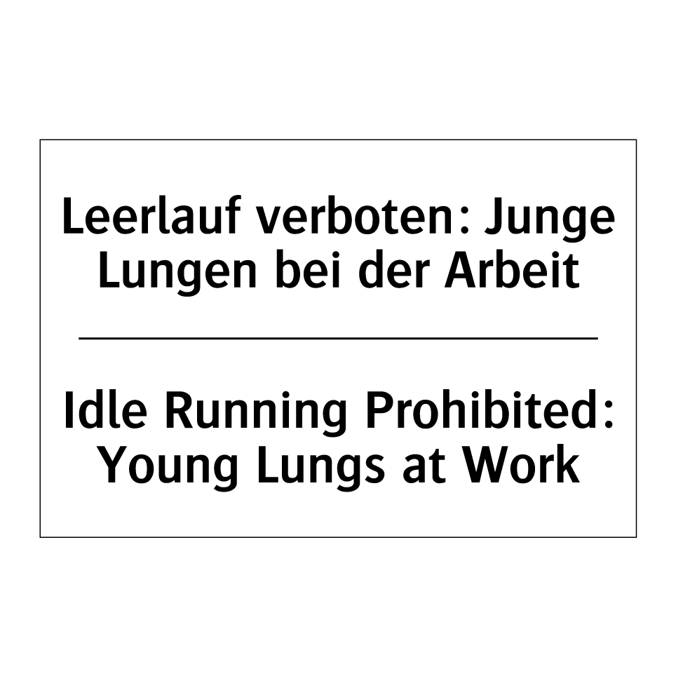 Zweisprachiges Verbotsschild mit deutschem Text Leerlauf verboten: Junge Lungen bei der Arbeit und englischem Text Idle Running Prohibited: Young Lungs at Work