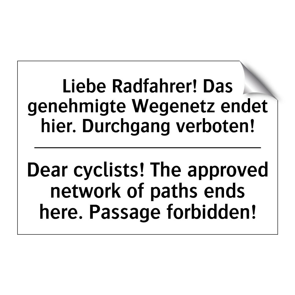 Zweisprachiges Verbotsschild mit deutschem Text Liebe Radfahrer! Das genehmigte Wegenetz endet hier. Durchgang verboten! und englischem Text Dear cyclists! The approved network of paths ends here. Passage forbidden!