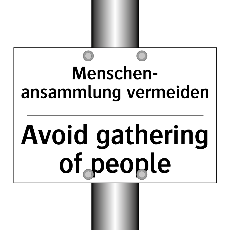 Zweisprachiges Verbotsschild mit deutschem Text Menschen- ansammlung vermeiden und englischem Text Avoid gathering of people