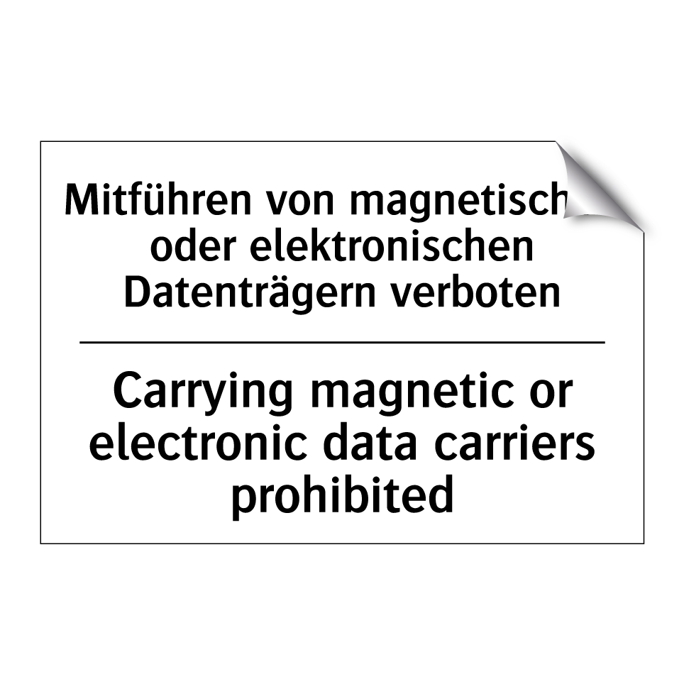 Zweisprachiges Verbotsschild mit deutschem Text Mitführen von magnetischen oder elektronischen Datenträgern verboten und englischem Text Carrying magnetic or electronic data carriers prohibited
