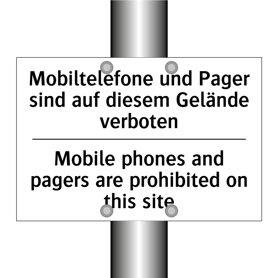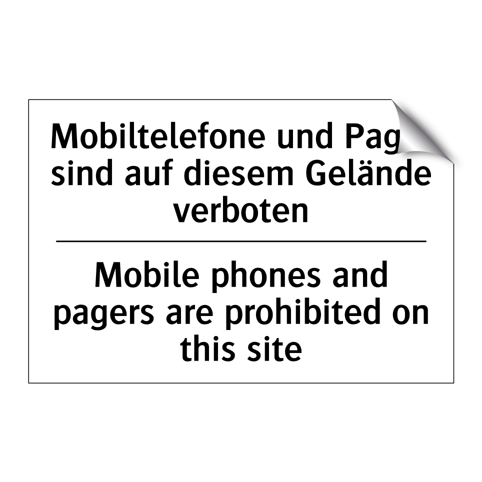 Zweisprachiges Verbotsschild mit deutschem Text Mobiltelefone und Pager sind auf diesem Gelände verboten und englischem Text Mobile phones and pagers are prohibited on this site